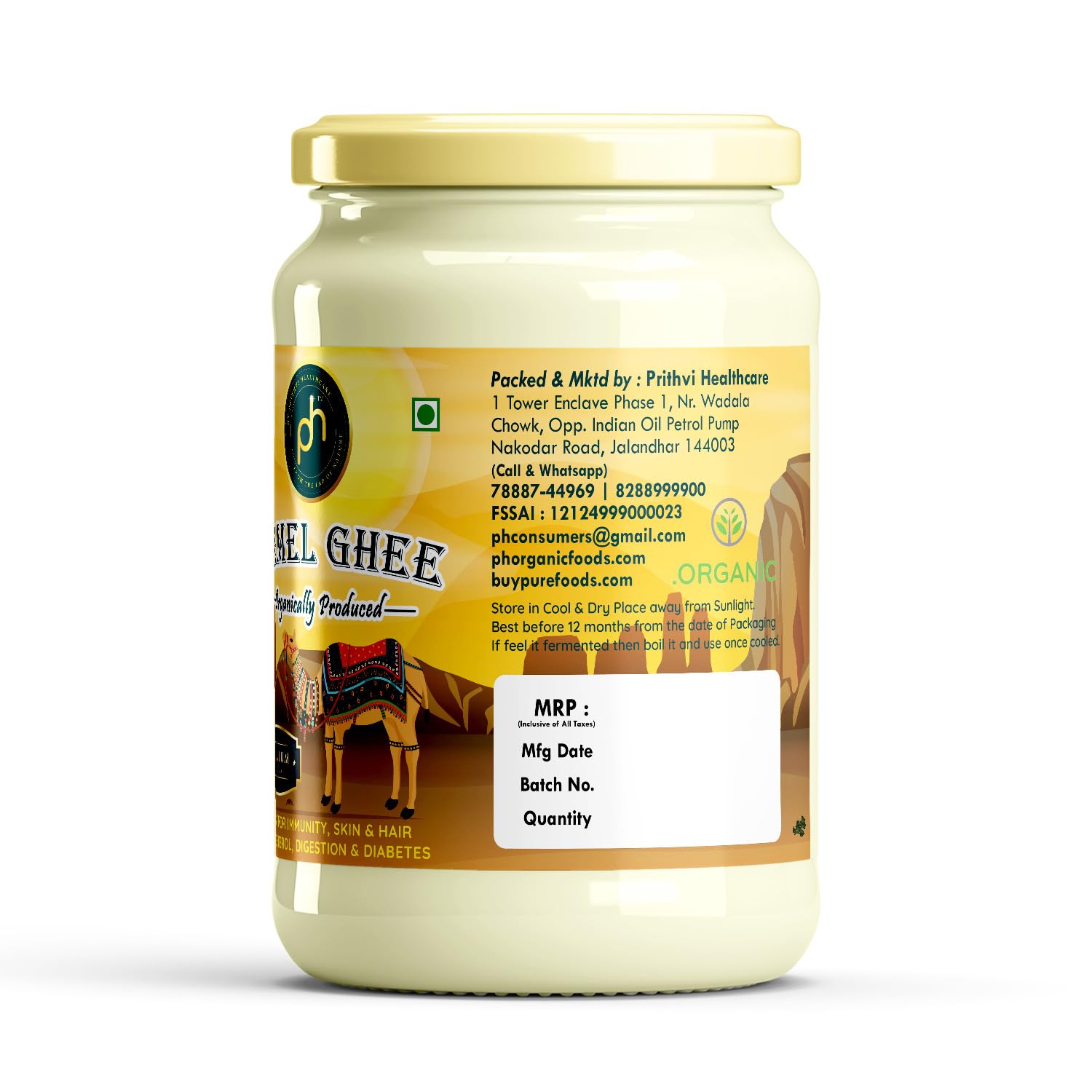 PH Organic Camel Milk Ghee (500 ML) is a rare and premium wellness fat prepared from pure camel milk, following traditional slow-heating methods to preserve its natural aroma, nutrients, and therapeutic properties. Revered in Ayurveda and desert cultures, camel milk ghee is known for its light digestibility, anti-inflammatory nature, and metabolic benefits, making it a powerful alternative to regular cow or buffalo ghee.